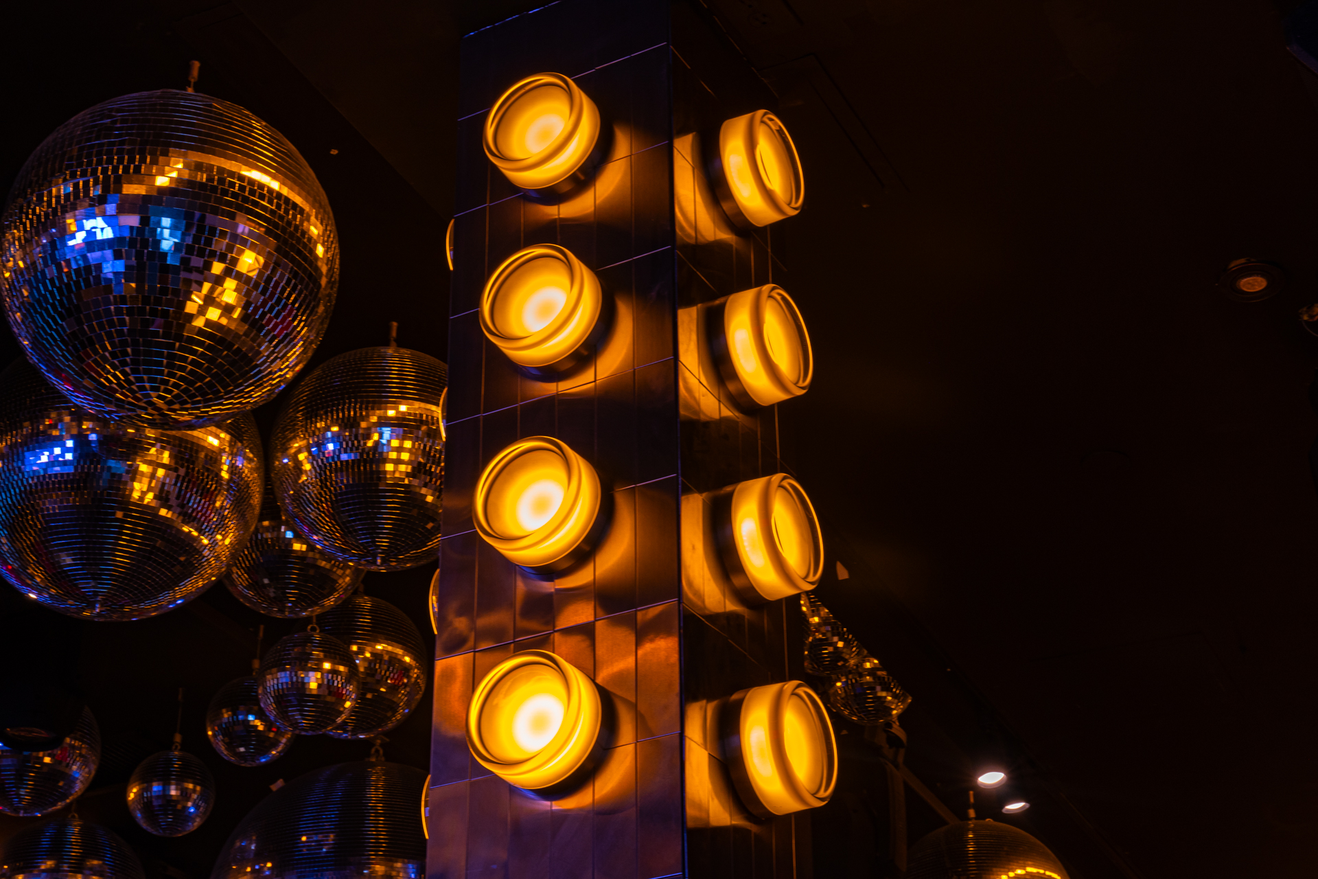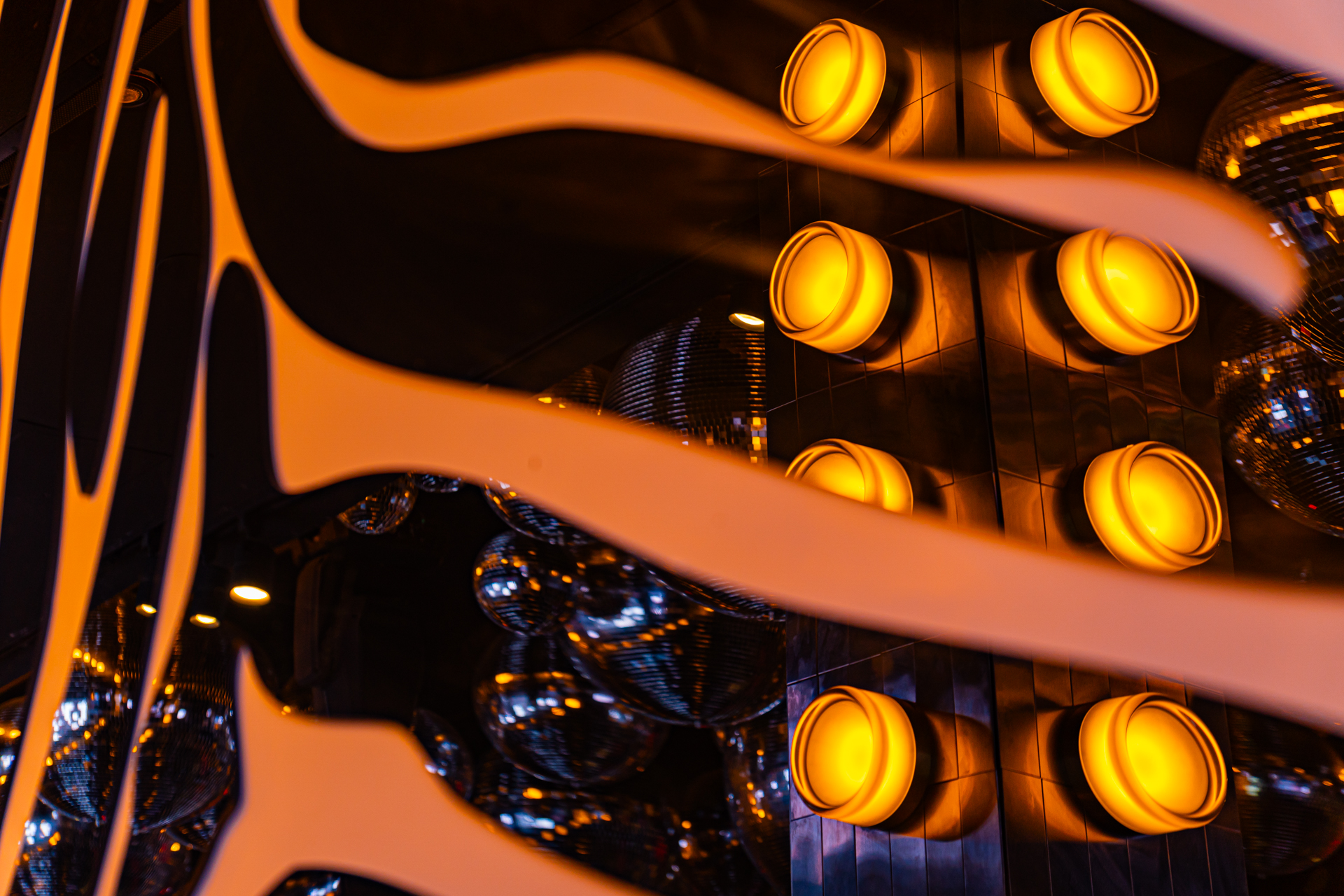Reflective & Architectural Enhancements: Structural columns were transformed into design features using reflective finishes and integrated lighting, adding depth and texture throughout the space while maintaining visual cohesion across the room.