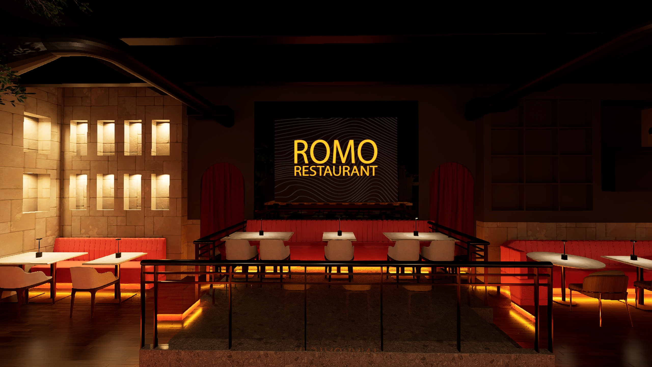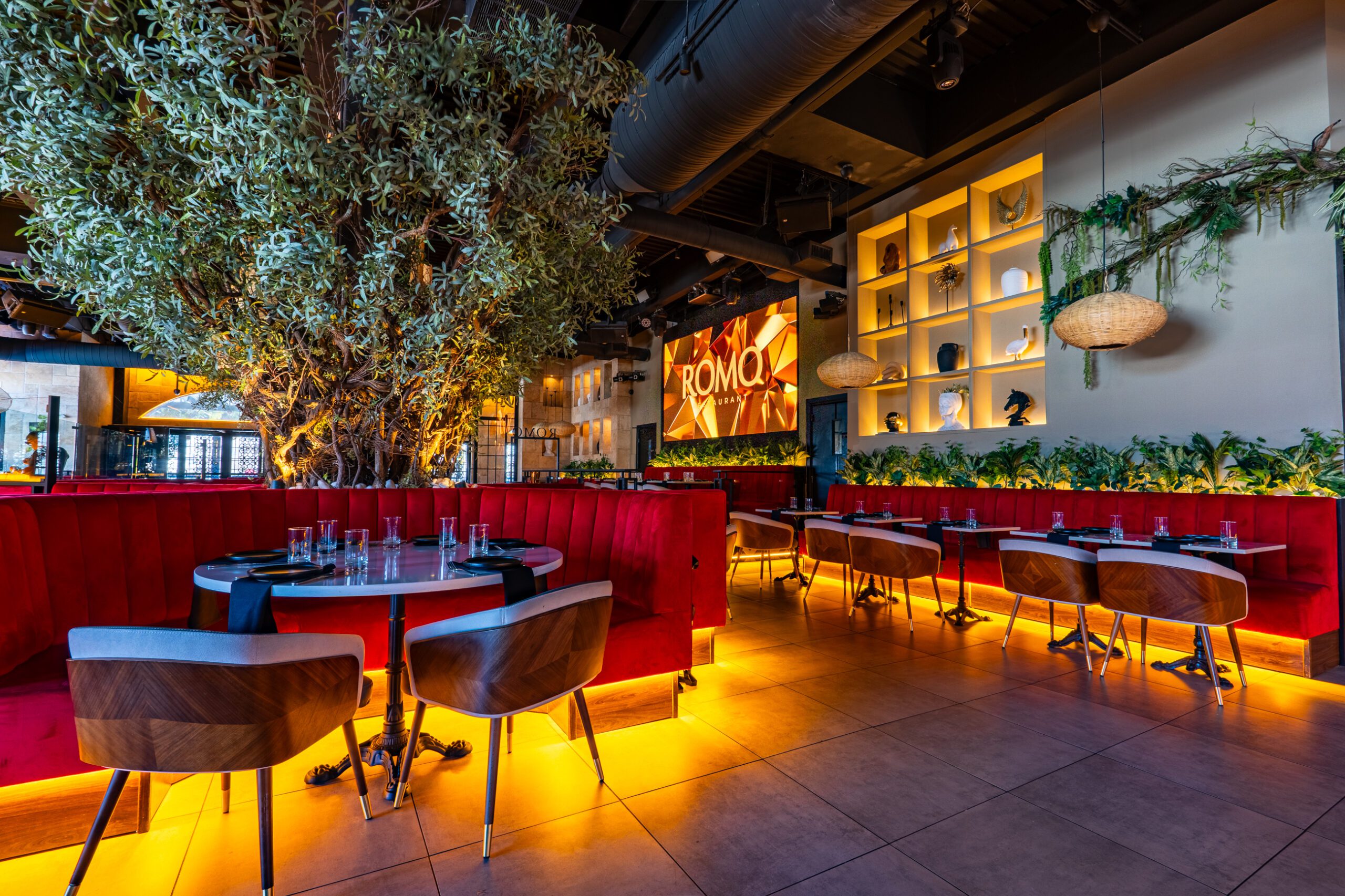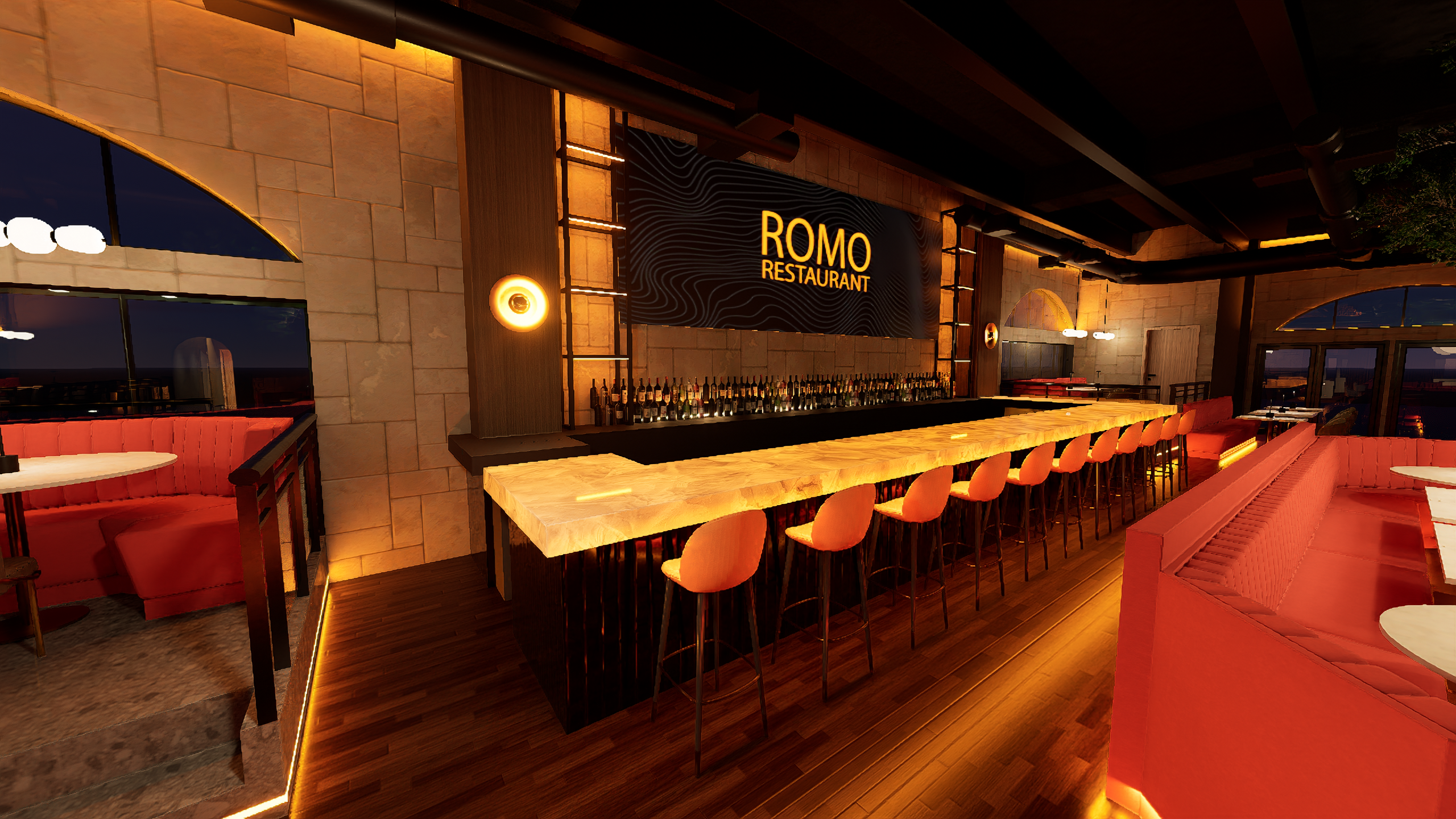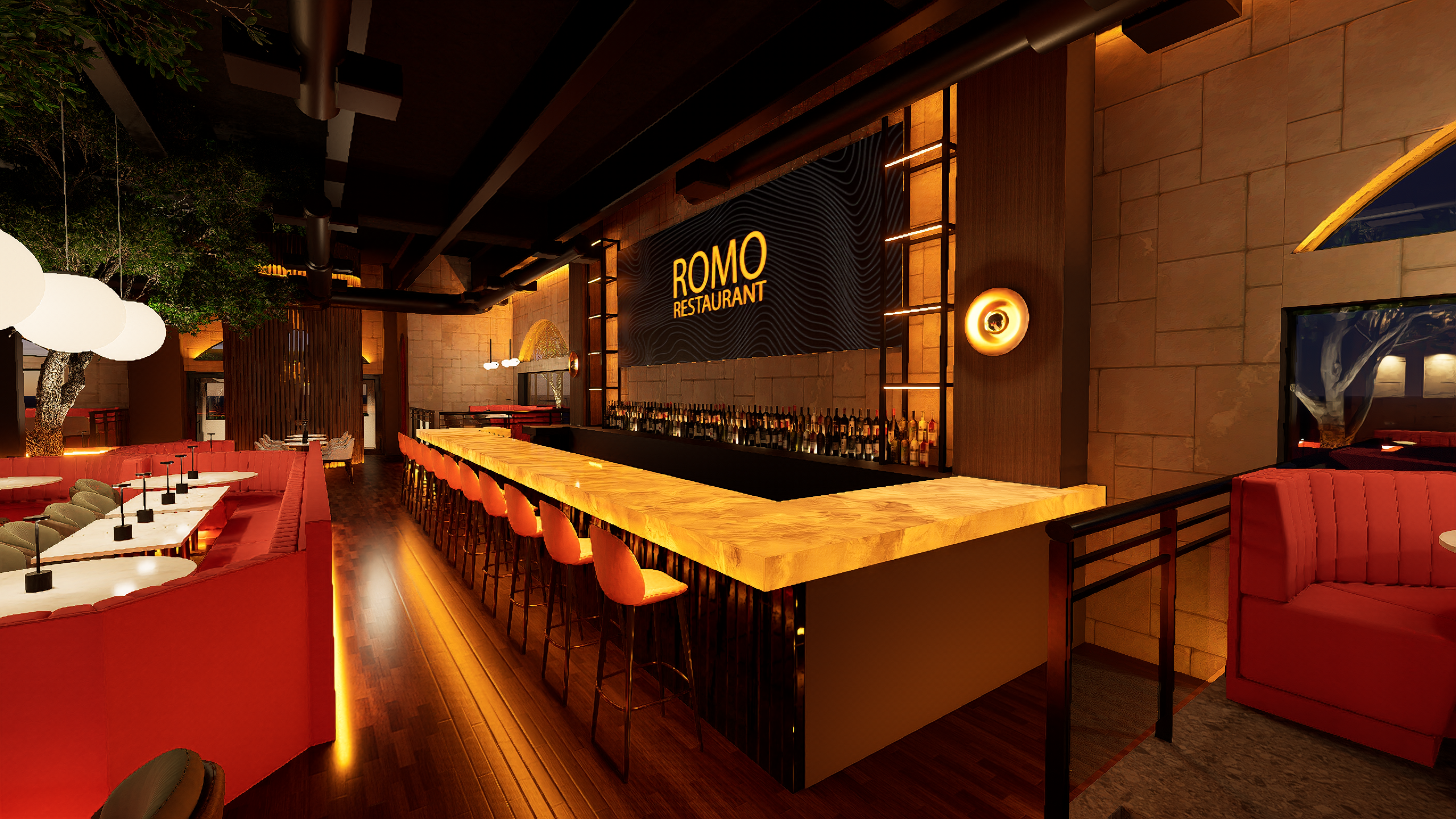 Romo Restaurant now stands as a vibrant hospitality destination that successfully blends refined dining with high-energy entertainment. The completed design delivers a visually striking environment where lighting, materials, and digital displays work together to create a cohesive and memorable guest experience. From the illuminated bar centerpiece to the layered lighting throughout the space, every detail contributes to a setting that feels both sophisticated and exciting.