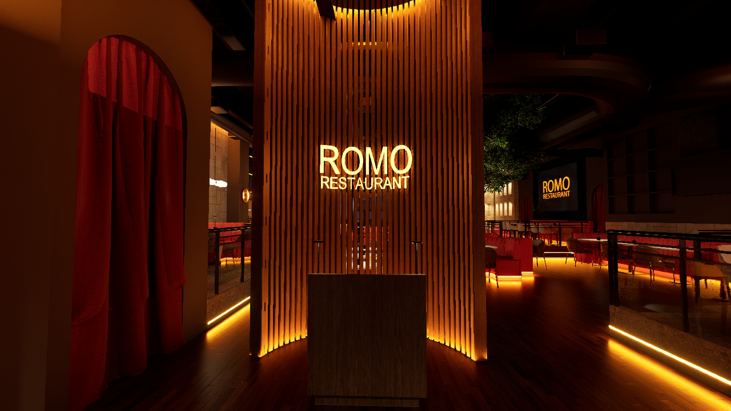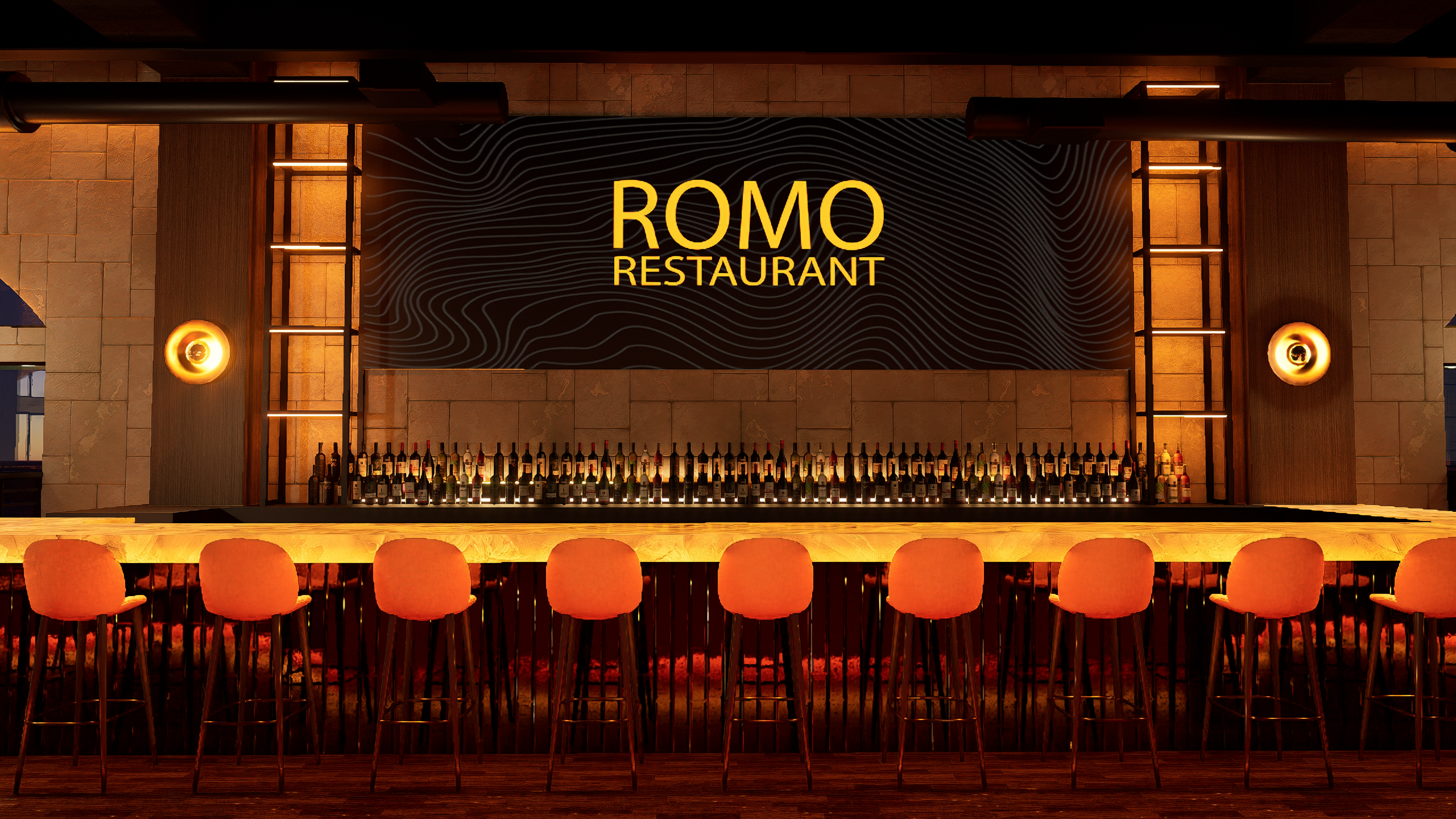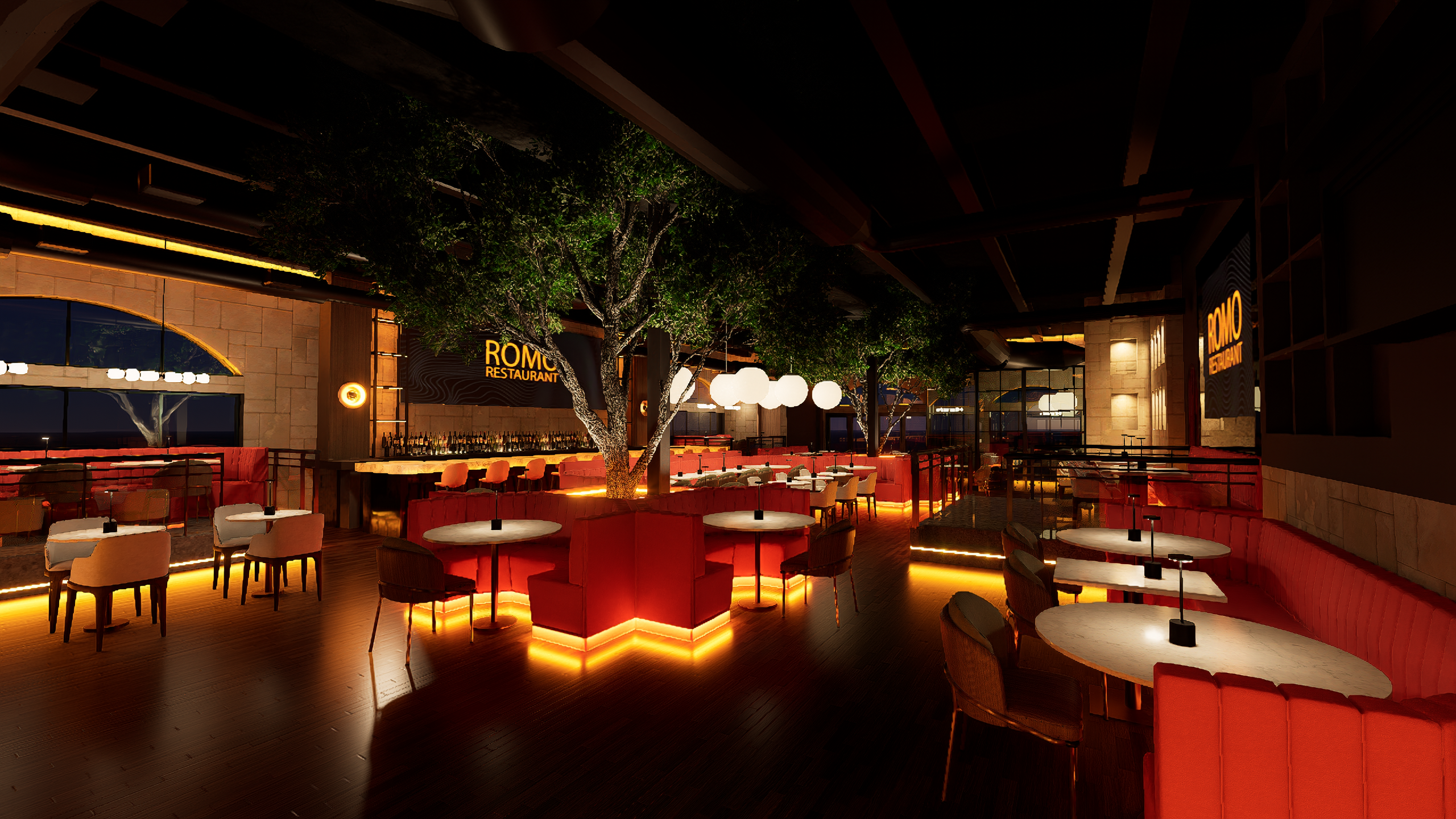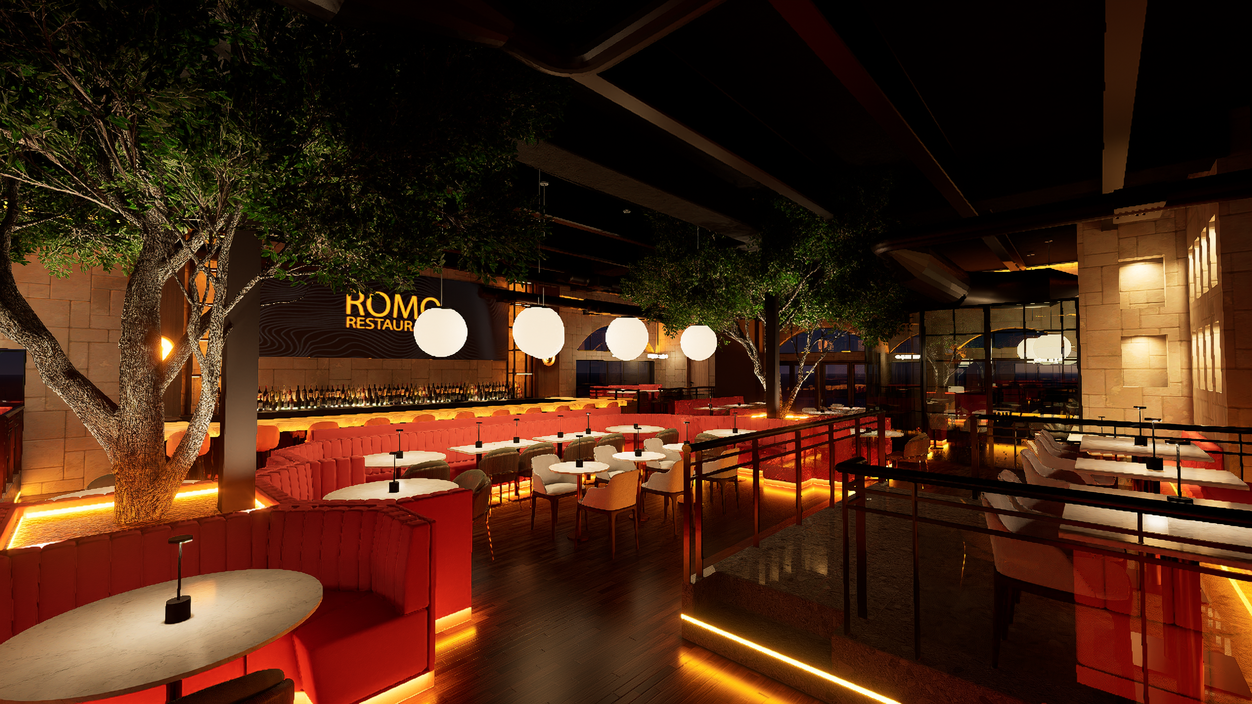 Romo Restaurant now stands as a vibrant hospitality destination that successfully blends refined dining with high-energy entertainment. The completed design delivers a visually striking environment where lighting, materials, and digital displays work together to create a cohesive and memorable guest experience. From the illuminated bar centerpiece to the layered lighting throughout the space, every detail contributes to a setting that feels both sophisticated and exciting.